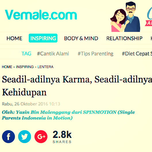 Dituliskan oleh Yasin bin Malenggang untuk rubrik #Spinmotion di Vemale Dotcom. Lebih dekat dengan Spinmotion (Single Parents Indonesia in Motion) di http://spinmotion.org/