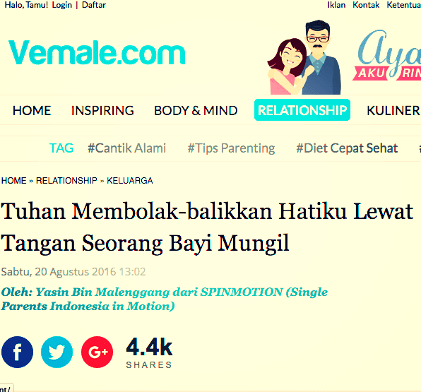 Dituliskan oleh Yasin bin Malenggang untuk rubrik #Spinmotion di Vemale Dotcom. Lebih dekat dengan Spinmotion (Single Parents Indonesia in Motion) di http://spinmotion.org/.